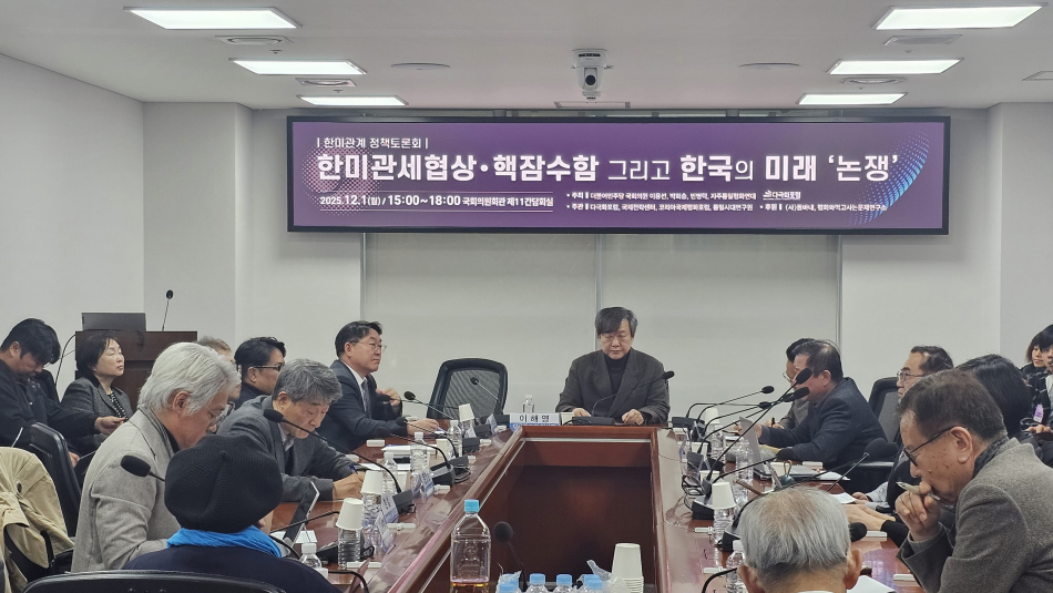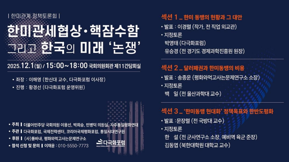 심포지움[한미관계 정책토론회] 한미관세협상·핵잠수함 그리고 한국의 미래 ‘논쟁’2025/11/302025년 12월 1일 월요일 오후 3시, 서울 여의도 국회의원회관 제11간담회실. 더불어민주당 이용선, 박희승, 민병덕 의원과…