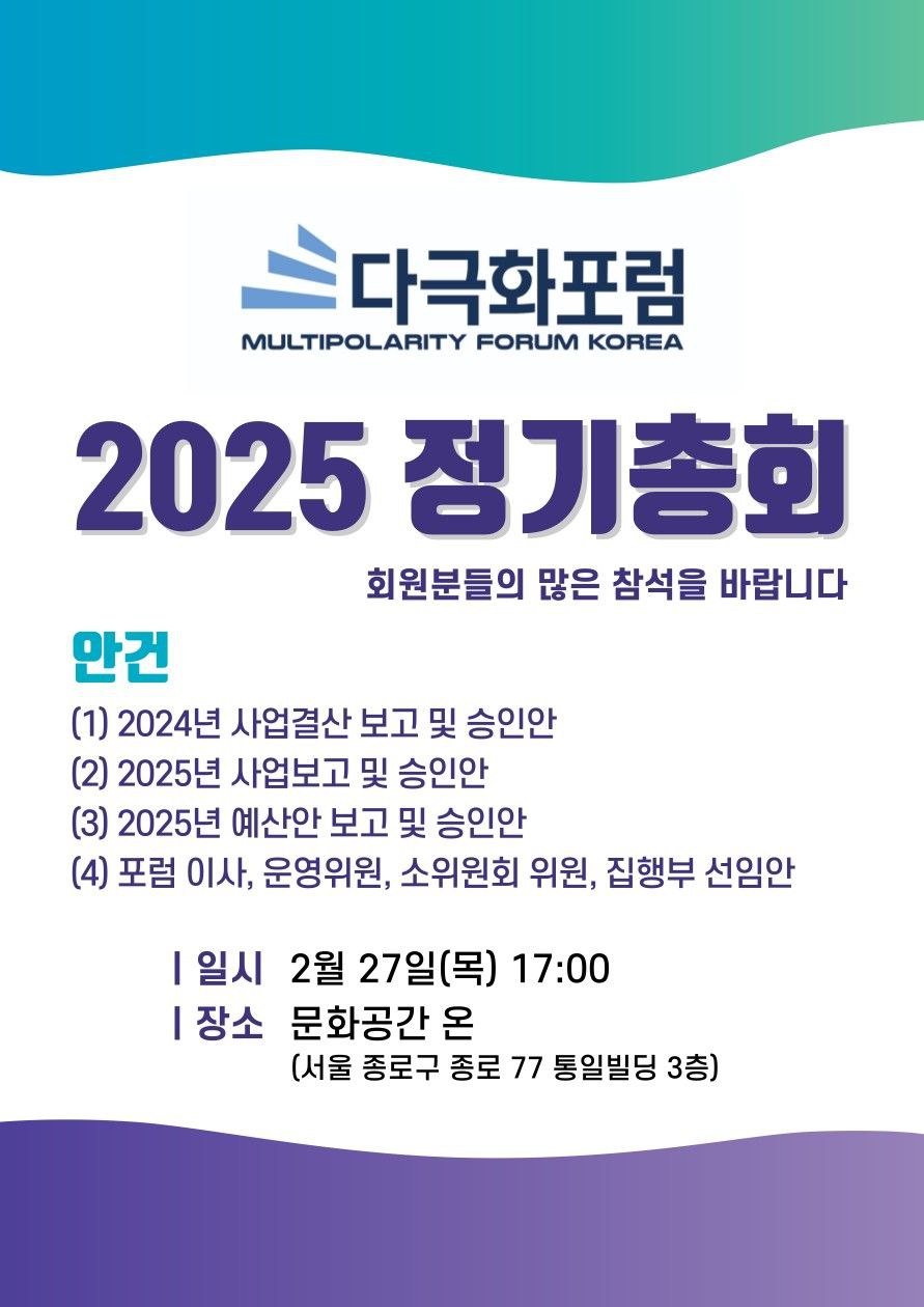 다극화포럼 2025 정기총회 2025/05/31다극화포럼은 2월 27일 정기 총회를 진행했습니다. 2024년의 사업을 정리하고 2025년 사업에 대한 열띤 토론과 아이디어를 나누는 자리였습니다. 2024년 다극화포럼의 활동에 함께해주신 분들에게 감사드리며, 2025년에도 다극화포럼의 활동에 많은 관심과 참여 부탁드립니다.
