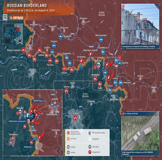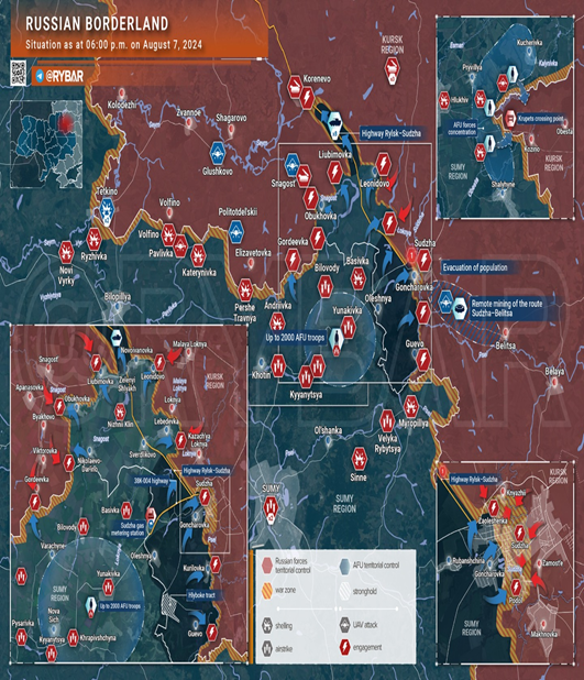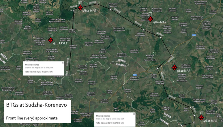 침공이후 우크라이나 정예군은 저 전선 남쪽 수자에서 북서 코레네보(Korenevo)를 연결하는 도로를 중심으로 북진하다 도로 곳곳에서 러군의 방어선에 막혀 있다. 이 지도상에 등장하는 흑해함대소속 제810 해병여단은 헤르손방면에 주둔하다, 우크라이나의 이 번 침공작전 이전에 이미 이동 배치된 걸로 알려져 있다. 침공초기 매우 빠르게 진군하는 우크라이나군을 맞아, 일정시간이후 위 제810 해병여단, 러남부군관구소속 제30연대, 러시아 총참모부직속 정보총국 제2여단을 중심으로 반격에 나서면서 위지도상의 전선에서 우크라이나군은 사실상 공세종말을 맞았다. 한 달 가까이 특히 지도상 서쪽 글루쉬코보지역 즉 세임강남쪽으로 서진해 점령지를 확장하고자 부단히 시도했지만 단 한 번도 돌파에 성공하진 못했다. 마찬가지 우크라이나국경쪽에서도 새로운 월경시도를 계속했지만 결과는 마찬가지였다. 쿠르스크전투의 대변인 역할을 하는 알라우디노프사령관이 어떤 인터뷰에서 말한 러군은 “서둘지 않는다(not busy)”는 말에 주목할 필요가 있다. 왜냐 하면 우크라이나 최정예병이 현전선에 고착, 파괴되고 있기 때문이다. 이 전구에서 병력과 장비가 파괴되는 것에 비례해 우크라이나군이 장악한 지역 역시 조금씩 축소될 수밖에 없다.