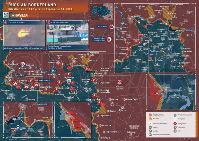 러시아군의 전격적인 반격이 개시된 후 빠른 속도로 우크라이나군 점령했던 마을을 탈환해 가고 있다. 첫 번째 그림은 9월 11일 오후 2시 30의 전황이다. 특히 좌측 글루쉬코보방향에서의 러군 진출이 활발하다. 제155해병여단과 제51근위공수연대가 투입되었다고 한다. 일부 과도하게 신장되어 있던 우크라이나군 일부는 포위를 피하기 위해 퇴각중이다. 지금까지 침공초기 약 6개 여단에 더해 이후 파견된 2개 여단과 수개 연대병력중 러국방부에 따르면 9월 10일 전후 약 12,000명의 우크군이 사상되고, 전차 80여대를 포함 수백대의 장갑차량이 파괴되었다고 한다. 러시아국방부 발표의 절반만 믿더라도 약 2개의 엘리트 여단 병력이 전멸했다는 말이다. 아디시피 쿠르스크전구에 투입된 우크라이나병력은 최정예 병력이다. 일부는 최주요전선인 돈바스에서 차출된 병력이다. 게다가 ‘전략적 예비대’까지 동원했다.