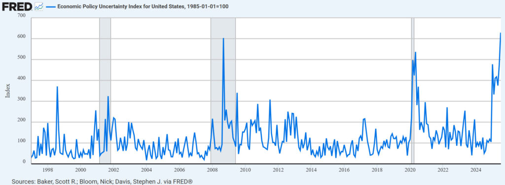 그 FRED 그래프는 2월까지만 포함하고 있었다. 트럼프의 경제 정책에 대한 의구심은 이미 그때도 높은 수준이었다. 그의 관세 게임의 결과는 아직 가시화되지 않았다.