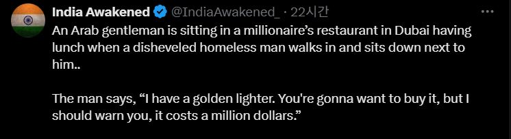 “나한테 황금 라이터가 하나 있습니다. 당신이 사고 싶어 할 겁니다. 하지만 미리 말해두죠. 가격은 백만 달러입니다.”