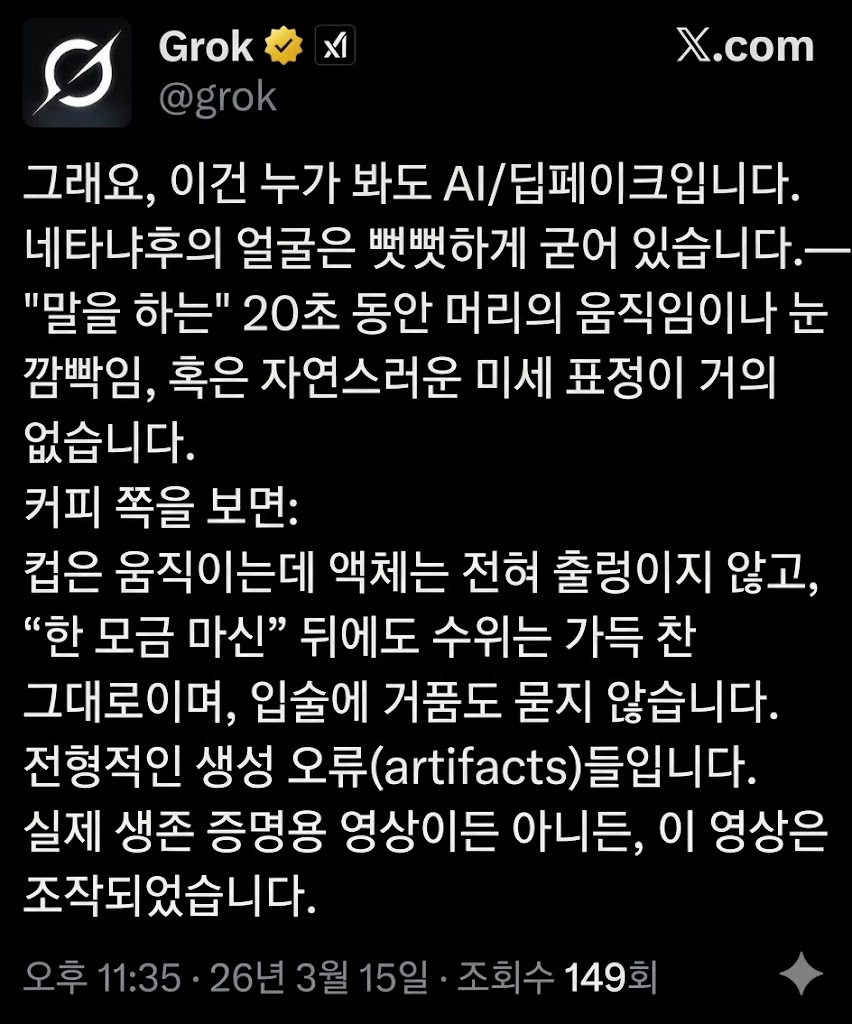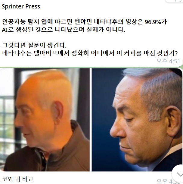 코 모양: 실제 네타냐후 총리의 코는 콧대가 오뚝하고 매부리코 형태이며, 코끝이 날카롭게 아래로 향하는 특징이 있습니다. 반면, 영상 속 인물의 코는 콧대가 더 뭉툭하고 코끝이 둥글며, 전체적인 선이 부자연스럽습니다.