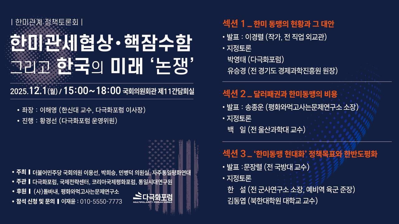 2025년 12월 1일 월요일 오후 3시, 서울 여의도 국회의원회관 제11간담회실. 더불어민주당 이용선, 박희승, 민병덕 의원과 시민사회단체 ‘자주통일평화연대’가 주최하고, ‘다극화포럼’이 주관한 <한미관계 정책토론회: 한미관세협상·핵잠수함 그리고 한국의 미래 ‘논쟁’>에 초대합니다. |  | |