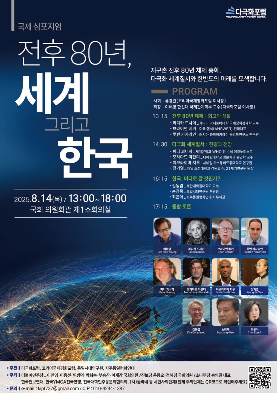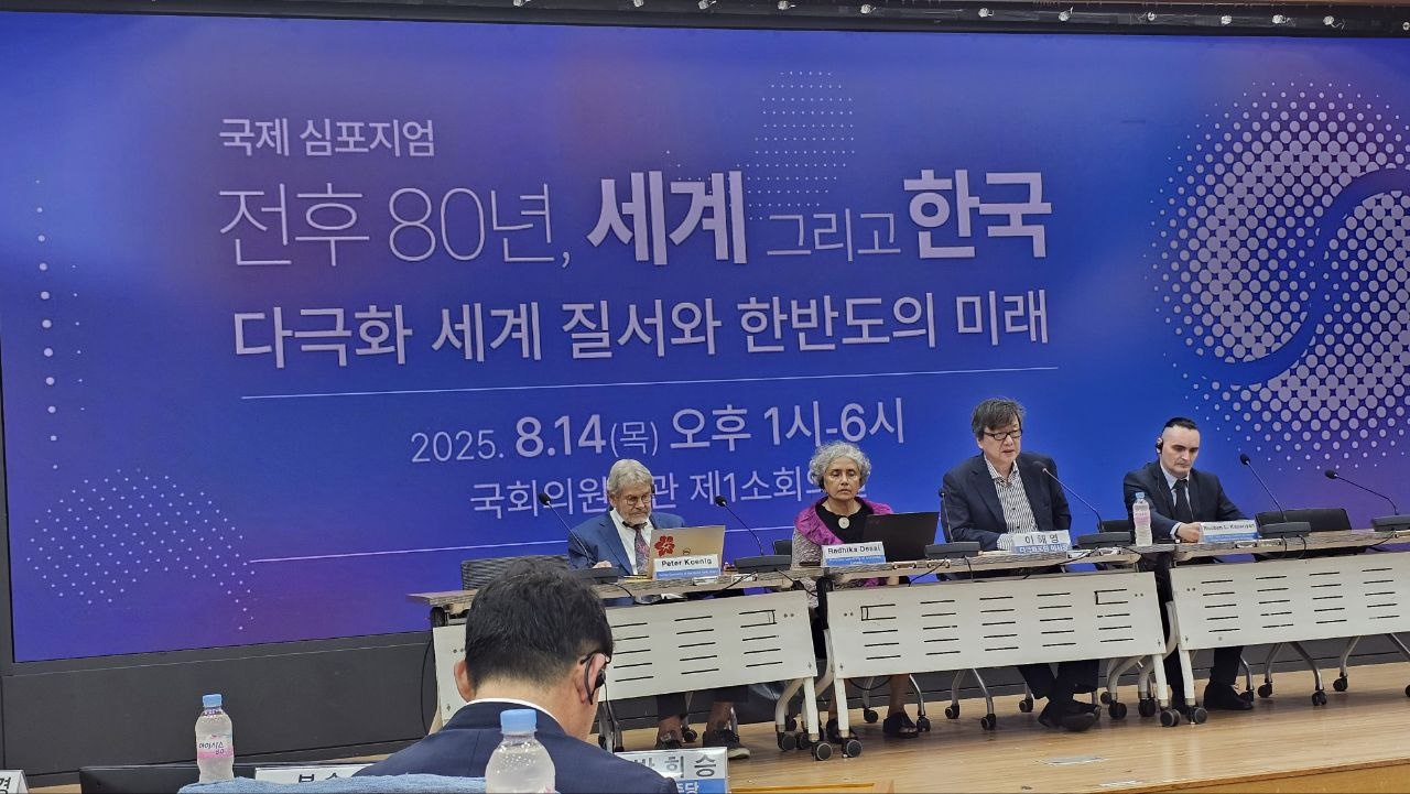 지구촌의 전후 80년 체제를 종합하고 새로운 다극화 세계질서와 한반도의 미래를 모색하는 국제심포지엄이 ‘다극화포럼'(이사장 이해영 한신대 국제관계학부 교수) 등의 주관으로 14일 국회의원회관 제1소회의실에서 열렸다. 이날 국제심포지엄은 다극화포럼과 (사)코리아국제포럼, 통일시대연구원, 자주통일평화연대가 공동주관하고, 더불어민주당의 이인영·이용선·민병덕·박희승·부승찬·이재강 의원, 진보당의 윤종오·정혜경 의원, 소나무당 송영길 대표와 한국진보연대, 한국YMCA전국연맹, 전국대학민주동문회협의회, (사)돌바내, 민주사회를위한변호사모임 한반도평화위원회 등이 공동주최했다. 오후 1시부터 시작되는 심포지엄은 4세션으로 나뉘어 오후 6시까지 진행됐다. 1세션에선 ‘전후 80년 체제에 대한 회고와 성찰’, 제2세션은 ‘다극화 세계질서의 현황과 전망’, 3세션은 ‘한국, 어디로 갈 것인가?’를 주제로 한 전문가 발표로, 4세션은 종합토론으로 구성됐다. |  | |
